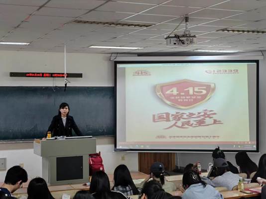 学院赵磊、鲍丽明、皮玥、郭苗苗、戢虹雨等教师开展国家安全教育进课堂活动,从“国家安全”“国家安全的分类”“国家安全教育日的内涵和设立原因”以及“维护国家安全怎么做”等方面进行了讲解,采用播放视频、案例讲解、互动问答等形式,创新宣传教育方法,激发学生学习国家安全知识的兴趣和热情,引导学生自觉遵守国家法律法规,切实履行责任义务,自觉维护国家安全。